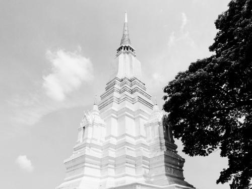 The white and gold pagoda (Chedi) is situated in the area known as the Hua Laem District or Tha Wasukri, on the bank of the Chao Phraya River. The pagoda is very attractive and can be seen from a distance. The architecture of the chedi consists of a single bell-shaped pagoda with its square base and twelve indented corners. On the top of the four niches over the square base are located smaller chedis without a Buddha statue. It has been gilded with gold paint from the relic chamber to the top of its spire. At that time, this area was the Royal Garden next to Wat Sop Sawan. King Chakkraphat ordered it to be combined into a temple and called it Wat Suan Luang Sop Sawan. Prince Damrong Rajanupab had an assumption that this pagoda might contain the queen’s relics, as it was built to honour Queen Somdet Phra Si Suriyothai, who sacrificed her own life in the elephant fight for the King Maha Chakkraphat.