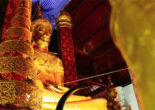 Before bidding farewell to the principal Buddha image, take a moment to raise your eyes to enjoy the beautiful stars delicately crafted into the ceiling. Another stop that should not be missed is the crafted wooden gable covered with lacquer and gilt and decorated with glass mosaics, depicting God Vishnu riding on the Garuda who is standing over the head of the Giant Serpent, supported by the Rahu face.