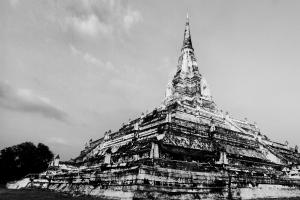 With a height of 90 metres, Chedi Phukhao Thong (Golden Mountain Pagoda) can be easily seen from a distance in the middle of Thung Phukhao Thong (The Golden Mountain Field) outside the City Island of Ayutthaya. During the peaceful political situation in the past, this area would be used as a rice farming and boat racing field during the flood season. However during several wars, this area was used as the military base for the military campground to wait for the enemy marching close to Ayutthaya